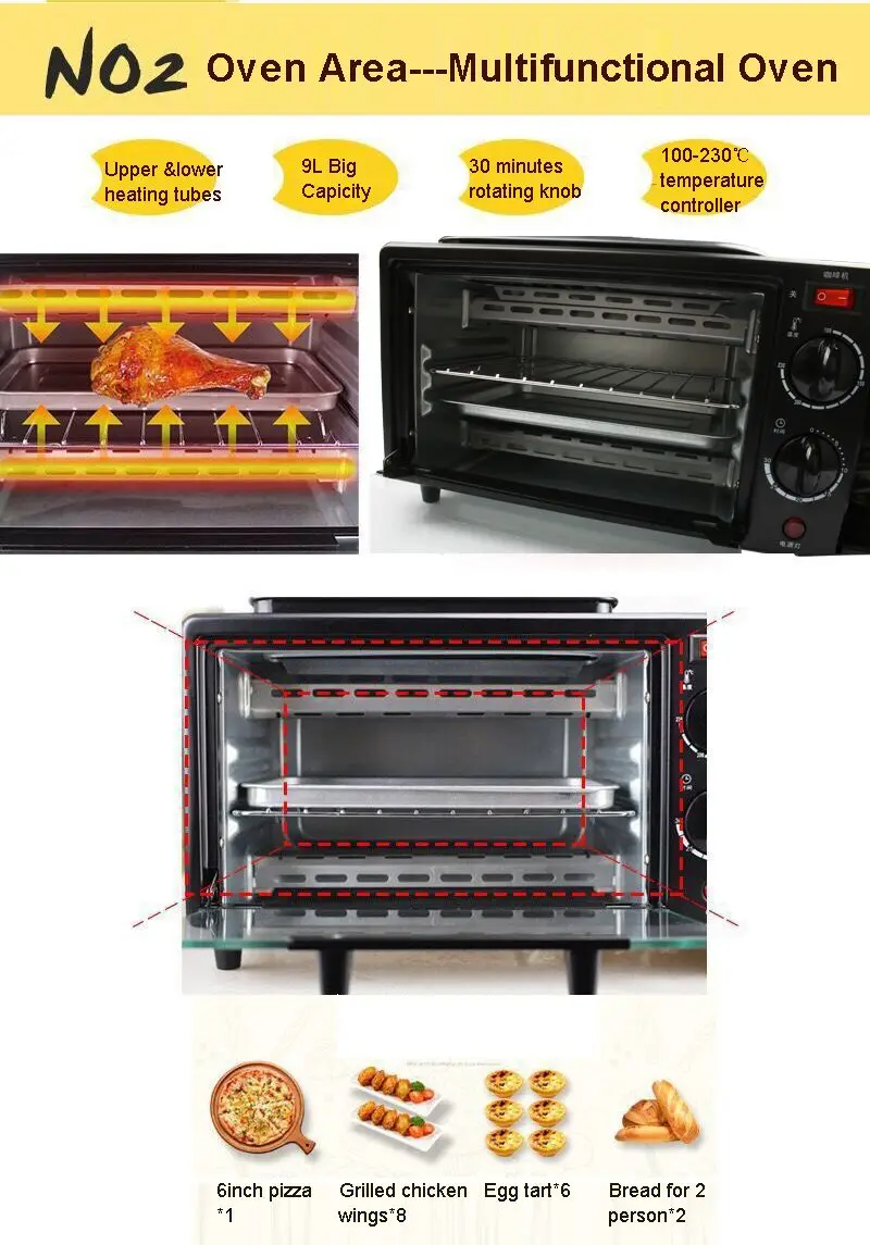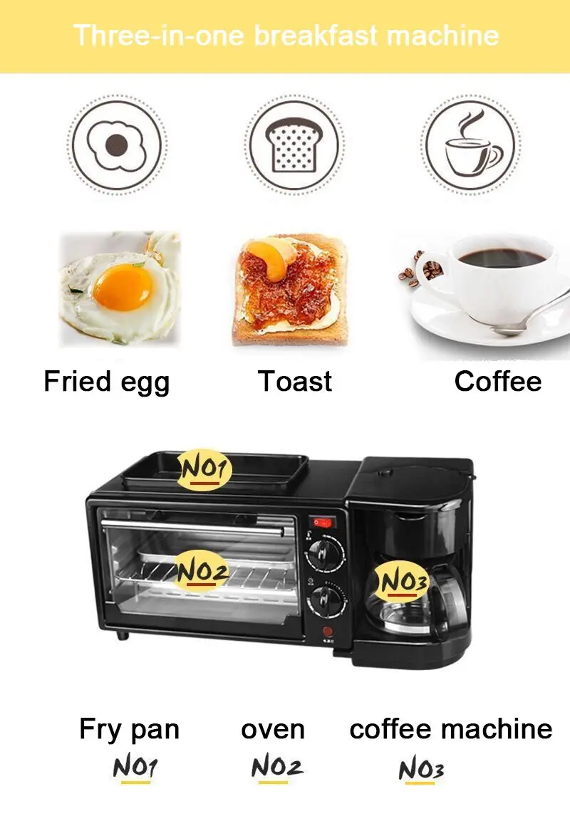 ماكينة الإفطار سعة الفرن: 9 لتر طاقة الفرن: 600 وات حجم المنتج: 45*18*19 سم قوة ماكينة القهوة: 450 وات وزن المنتج: حوالي 4.6 كجم نطاق درجة حرارة الفرن: 100 ~ 230 درجة مئوية الجهد المقدر: 220 فولت ~ 50 هرتز وقت الفرن الإعداد: 30 دقيقة